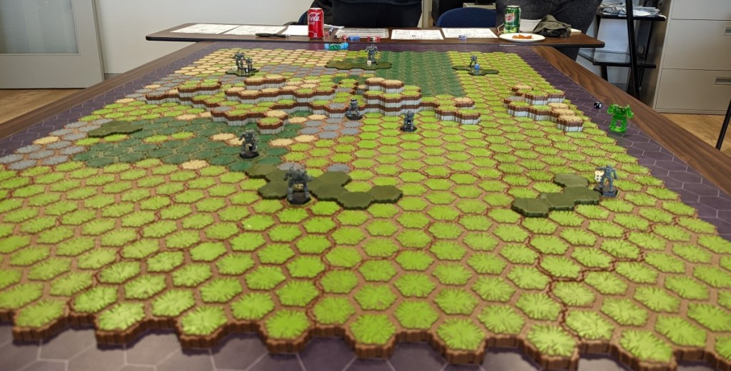 After a looong hiatus (thank you COVID), we got together again to play BattleTech. Several of the players were new to the game (and I was not altogether sure of all the rules), so the process was a bit slow. The two teams drafted ‘Mechs from a pool and both Lances rushed the hills.