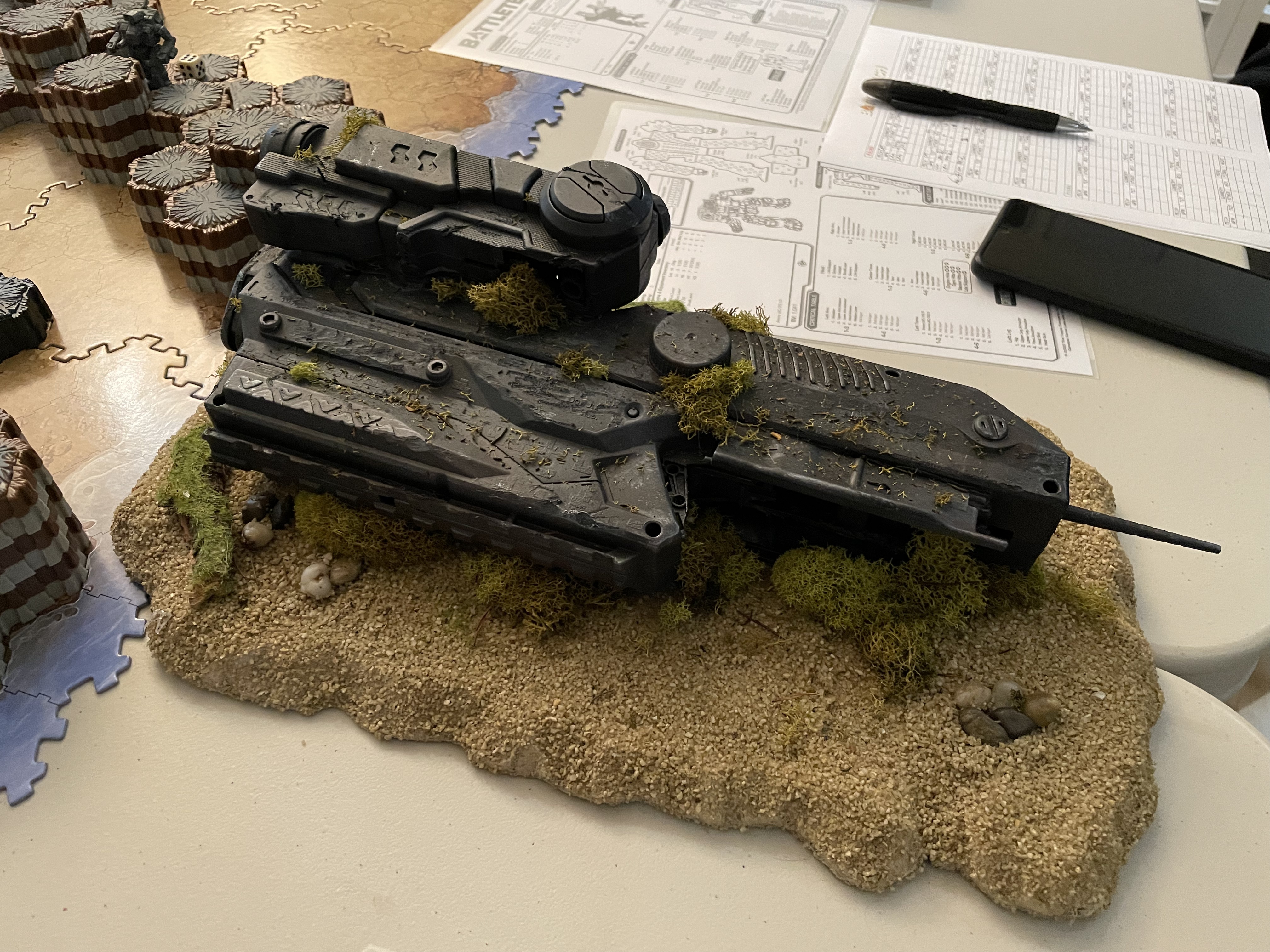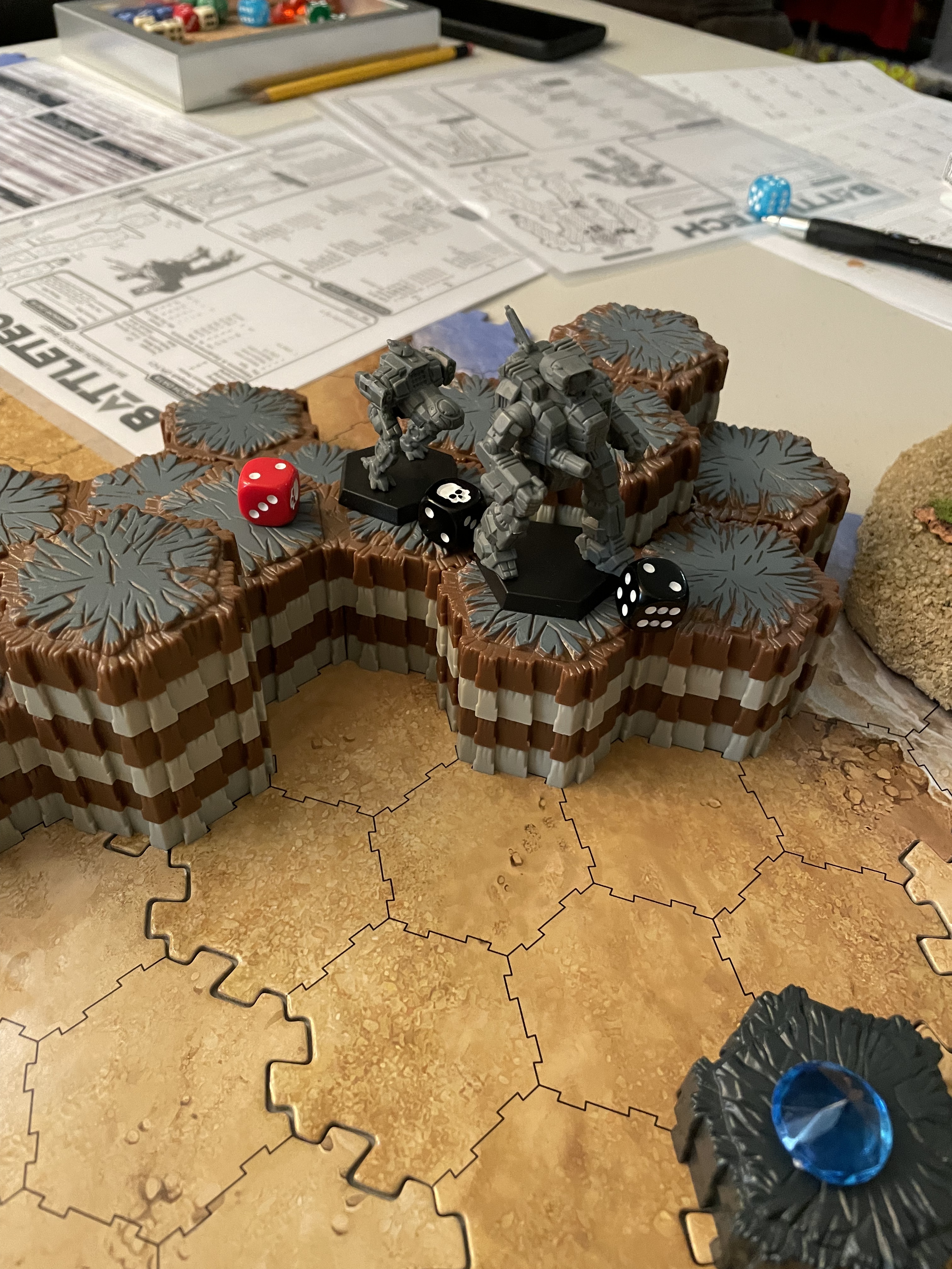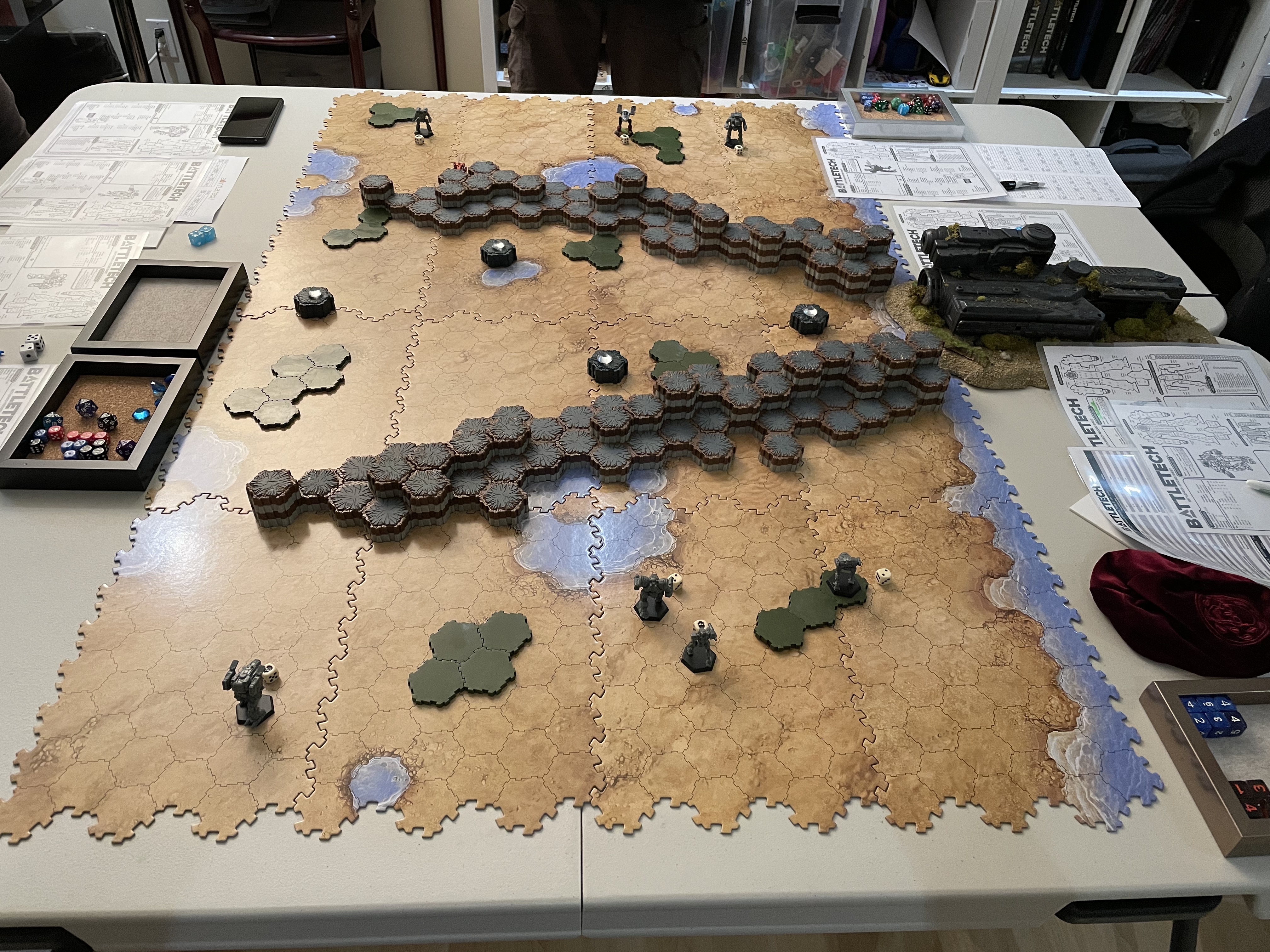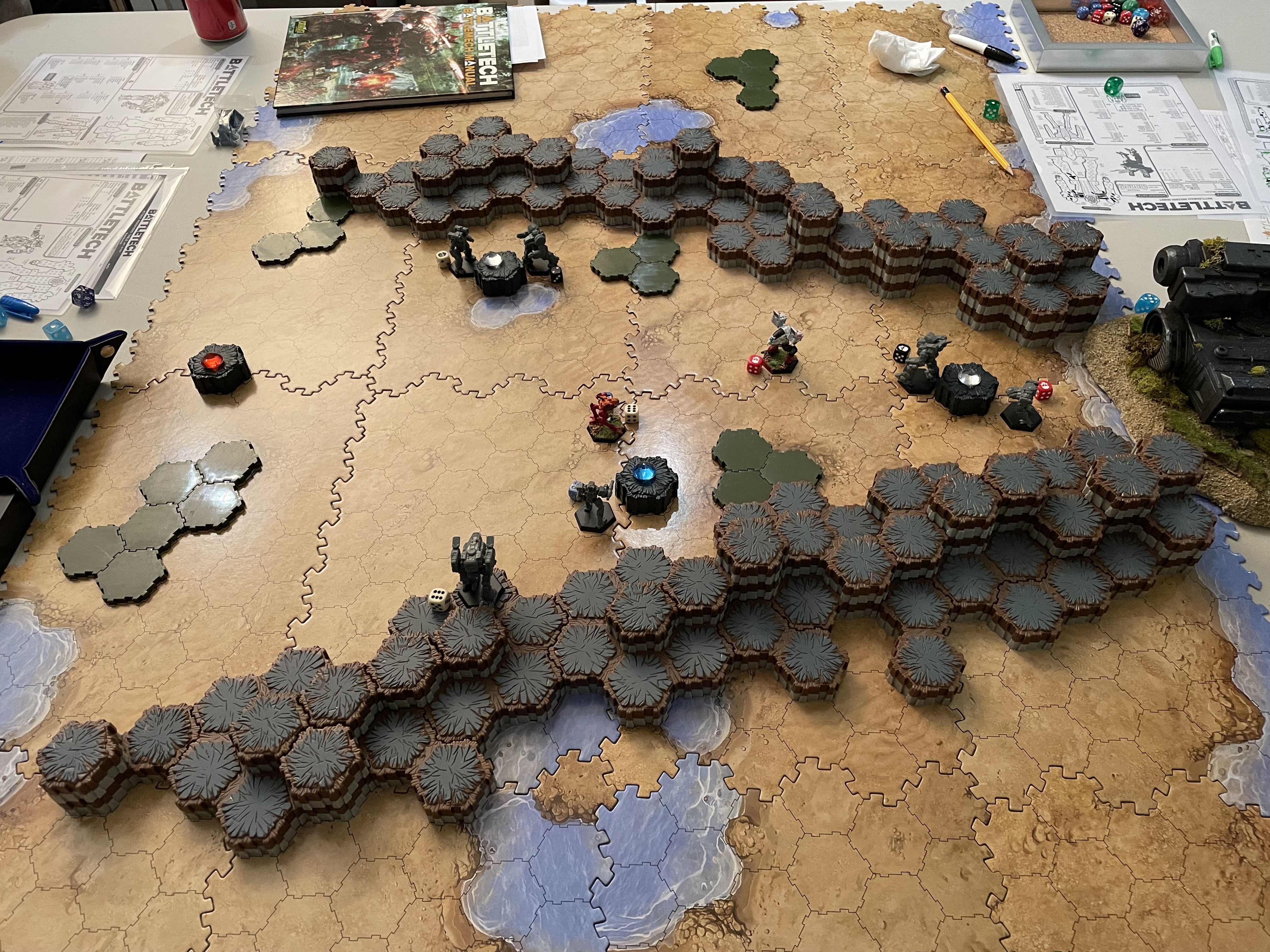 This was a “capture the objectives” scenario I designed, based on a few things I read online. We ran into some interesting situations like pushing a ‘Mech off a cliff and firing while prone–none of which we had done before. Again the Locust was the hero ‘Mech, capping two objectives early on to give the Death Commandos an early point lead. Though it was ultimately crippled and forced to withdraw, it did win them the game. It was the first time we tried playing a scenario, rather than a straight skirmish–something different to focus on. The forces were pre-made Lances that will be painted in “iconic” faction colors.